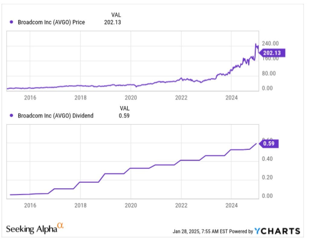 • Broadcom 주식은 지난 10년 동안 1,450% 상승했으며, 강력한 배당 성장으로 장기 투자에 적합함.